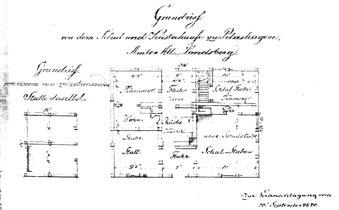 Grundriss vom Schul- und Küsterhaus und Grundriss von einem "neu zu